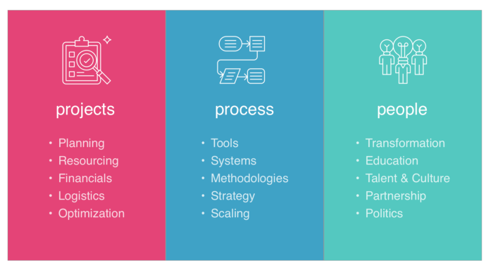 This includes all aspects of project management, such as: planning, resources, financing, logistics and optimization practices. To this end, Design Ops is responsible for :