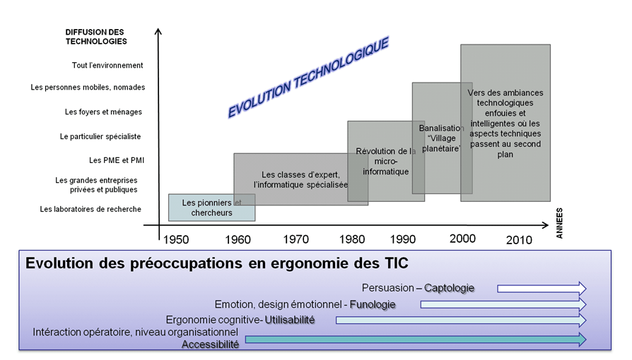 Dans les dernières décennies, plusieurs étapes ont été franchies pour nous permettre d’arriver à la phase de “l’expérience” où nous en sommes aujourd’hui. Tout a commencé dans les laboratoire des chercheurs avec les interactions homme-machine pour ensuite s’accélérer rapidement avec l’arrivée du web avec le design graphique, le design web, la conception centrée utilisateur et les ergonomes avec une vision plus large que la simple interface (ils incorporent les aspects physiques et cognitifs dans l’expérience). Un des termes les plus connus est l’utilisabilité, qui aborde l’aspect de l’efficacité et de l’efficience.